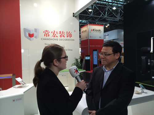 做為中國參展企業(yè)的代表,常宏裝飾總經(jīng)理王躍先生在展位接受了展會主辦方(杜塞爾多夫展覽公司)的采訪,就歐洲零售業(yè)、中國零售業(yè)和EuroShop等主題闡述了常宏裝飾的觀點和建議。
