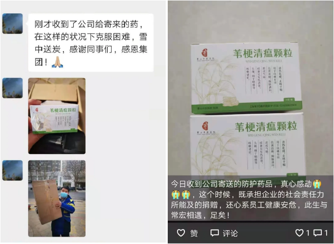 2021年,新冠疫情再度爆發(fā),香港旭日集團(tuán)及常宏本部心系員工健康,選了經(jīng)過2020年初抗疫前線應(yīng)用的有效藥品「葦梗清瘟顆粒」(「備案文號」贛藥制備:Z20200002000)發(fā)放給全體員工。1月初,常宏將首批顆粒發(fā)放給一線工人,后受疫情影響,在石家莊市快遞恢復(fù)的第一時間,14日起陸續(xù)將藥品以郵寄的形式發(fā)放給全體員工,用于大家預(yù)防新冠肺炎,以實際行動關(guān)心關(guān)愛員工,讓大家安全感滿滿。