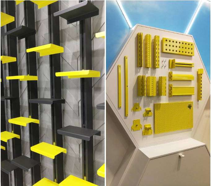 1、道具采用標(biāo)準(zhǔn)化設(shè)計(jì)、模塊化組合,具備拆裝組合的能力,無(wú)論什么尺度的道具一定是分體組合的。而且鋼立柱的種類繁多,結(jié)合各類支架、層板和不同的顏色噴涂組合而成形式多樣的道具。