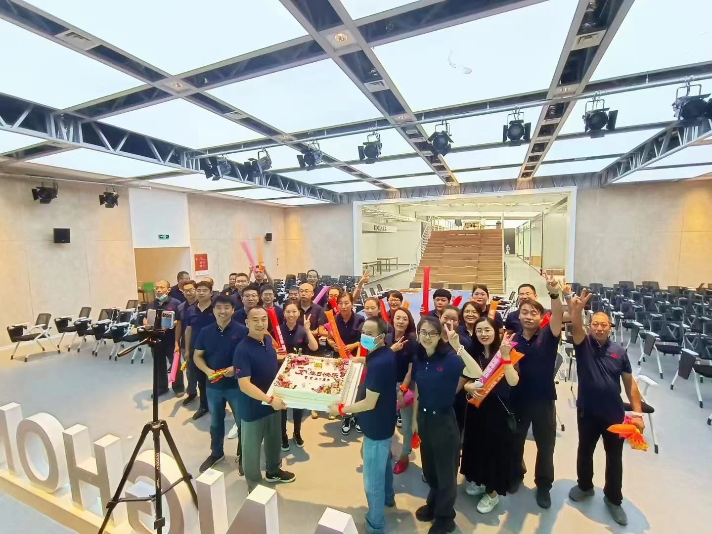 因?yàn)橥蝗缙鋪?lái)的疫情,我們?cè)驹诨I備過(guò)程中的線下活動(dòng)被緊急叫停,沒(méi)有靜默的常宏正定產(chǎn)業(yè)園還在堅(jiān)持生產(chǎn),成為了我們唯一的線下活動(dòng)會(huì)場(chǎng)。能夠相聚的常宏人在產(chǎn)業(yè)園展示中心共同參加線上慶典活動(dòng),伴隨著美味的蛋糕和生日歌為常宏送上最美好的生日祝福。